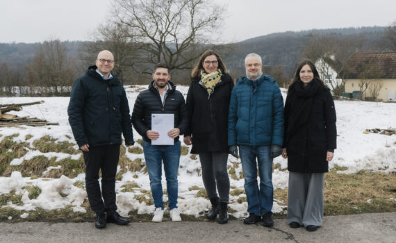 Am Rodweg in Hausen, am Ende der Straße, wo die Siedlung in Ackerflächen übergeht, steht eine junge Bad Kissinger Familie dank des Bauturbos endlich am Anfang ihres Eigenheim-Traums. Bei bitzelnder Februarkälte übergab Oberbürgermeister Dr. Dirk Vogel dem Bauherrn Christian Roßmann jüngst die lang ersehnte Baugenehmigung für das Einfamilienhaus der Familie.